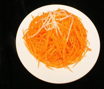 第二种方法就是直接用专门的擦丝工具——擦丝板直接擦(擦出的丝比较细),最好也先切段。飞利浦的有切片和切丝机器卖,但是这样的工具价格很贵,买来只切胡萝卜丝,有点大材小用的感觉,有那种几块钱的擦丝板,可能会更适合。但是使用工具,胡萝卜的汁水难免流出过多,吃起来软软的,营养也流失了不少,所以还是苦练刀功比较好!