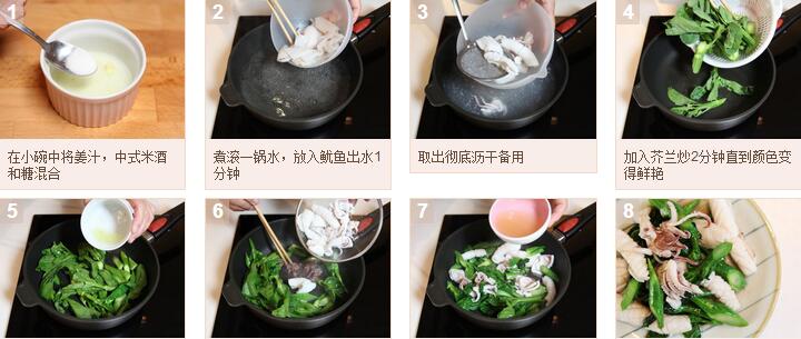 芥兰虾酱炒鲜鱿的材料:芥兰200克,新鲜鱿鱼2条约300克,鸡汤200mL,姜汁1汤匙,虾酱1汤匙,中式米酒1汤匙,糖1/2茶匙
