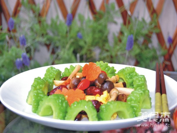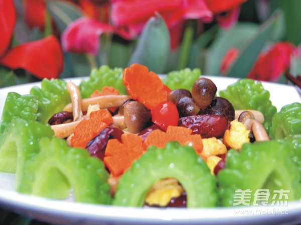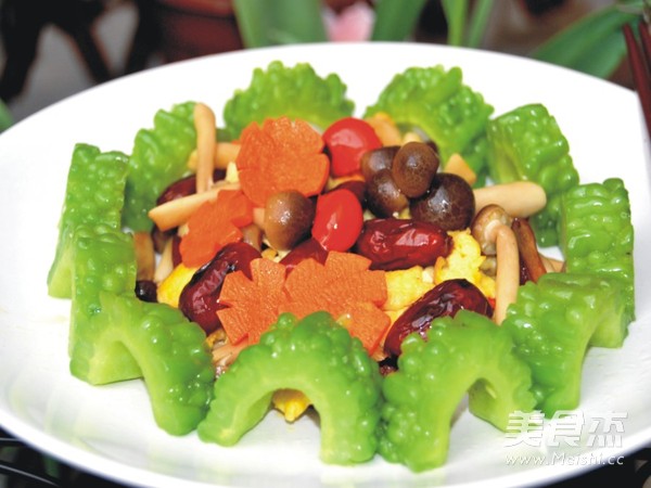 6.锅内放入少许油,倒入苦瓜煸炒,加少许水,然后放糖、盐略微煮一会儿。汤汁快收干时加鸡粉出锅