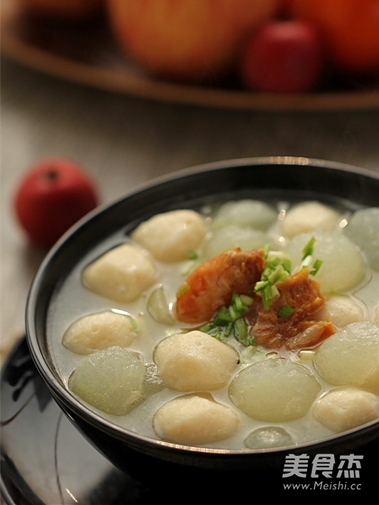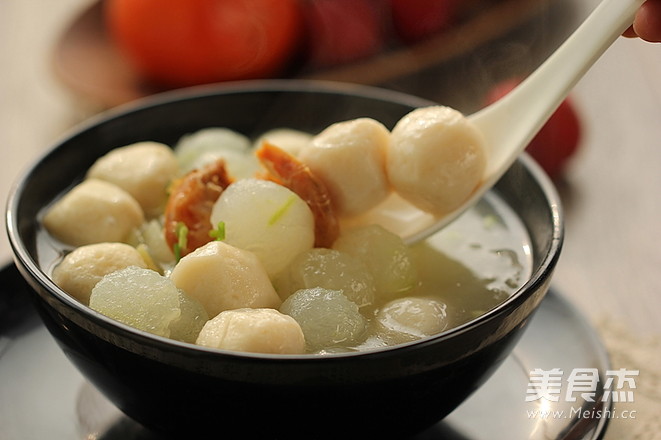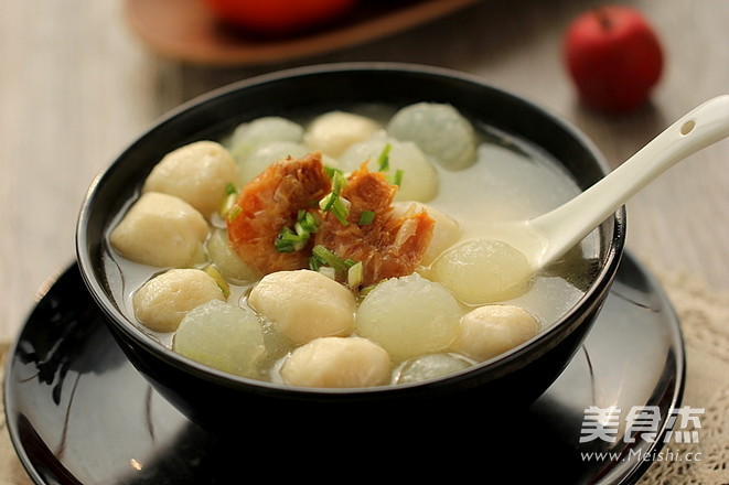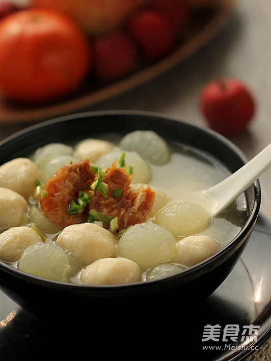 很简单的做法, 将冬瓜挖成小球状, 与鱼丸一起放入高汤中煮, 提味的秘诀在于放入里面的虾仁, 干虾仁的鲜味融入到汤中,与冬瓜清甜、鱼丸鲜美相互呼应, 让这道清淡甘甜的汤变得更有滋味。