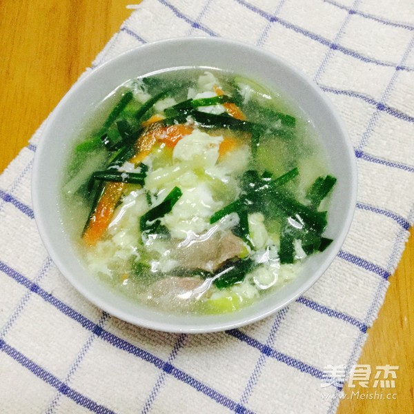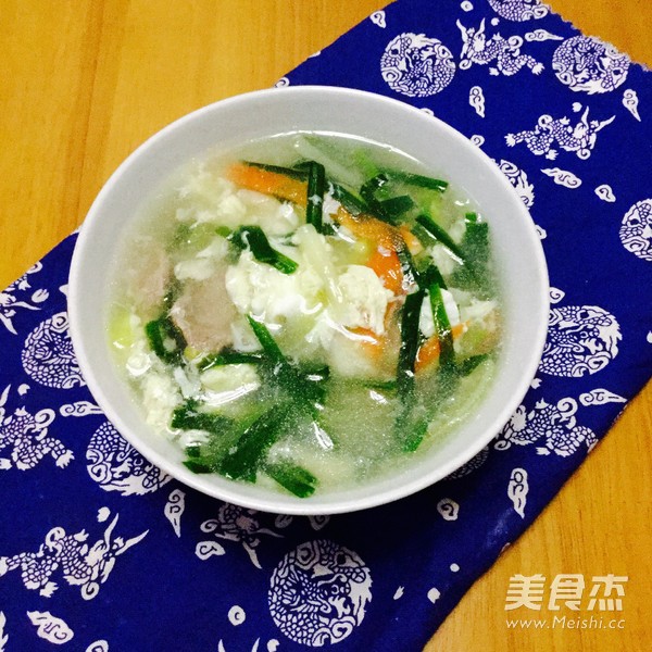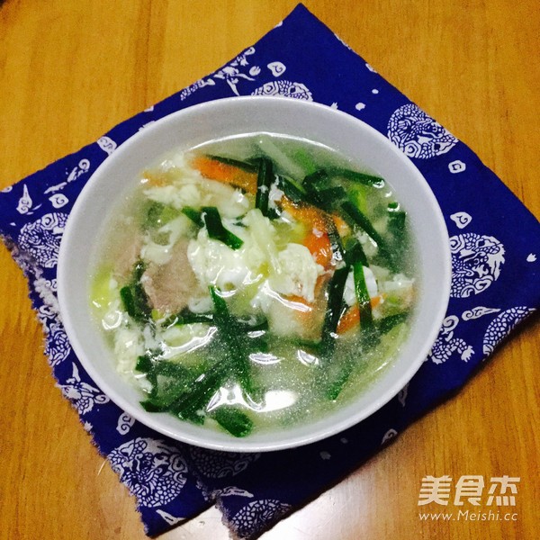 把现成的材料混乱弄出一个汤来 主料 瘦肉100克 鸡蛋150克 韭黄50克 韭菜50克 胡萝卜30克 杂锦汤的做法 1.韭黄、韭菜切段,瘦肉切片,胡萝卜切条 2.韭黄、韭菜切段,瘦肉切片,胡萝卜切条 3.瘦肉用油盐腌5分钟,鸡蛋打开到碗里 4.搅散鸡蛋 5.汤锅加入水,放入姜片,烧开 6.水烧开后,加入瘦肉煲5分钟 7.加入胡萝卜丝 8.加入韭黄韭菜段 9.搅拌一下,加入盐调味 10.倒入蛋液,搅拌均匀便可 烹饪技巧 各种材料都煮熟便可