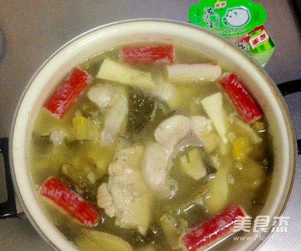草鱼700克 酸菜1包 冬笋1个 蟹棒1份 生菜1棵 浓汤宝2块 豆腐1盒