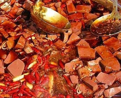 70年前,沙坪坝磁器口古镇水码头有一王姓屠夫每天把卖肉剩下的杂碎,以贱价处理。王的媳妇张氏觉得可惜,于是当街起卖杂碎汤的小摊,用猪头肉、猪骨加豌豆熬成汤,加入猪肺叶、肥肠,放入老姜、花椒、料酒用小火煨制,味道特别好。在一个偶然机会,张氏在杂碎汤里直接放入鲜生猪血旺,发现血旺越煮越嫩,味道更鲜。这道菜是将生血旺现烫现吃,遂取名毛血旺。