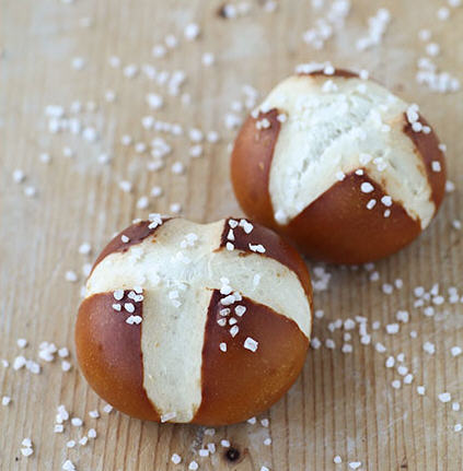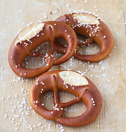 很多面包店使用德国碱面包作为标志。它的特点在于烤前浸包碱水而形成特有的色泽和风味。它算是很快速的面包,发酵时间短或者完全不发酵,至少比一般软面包减少一半的时间。成品看起来好象很硬的样子,其实它跟“硬”挨不着,中间鼓的部分口感比较韧,细的部分则比较脆。它的成分很简单,因为泡过了碱水,有种碱香,特别开胃。它还常被叫做啤酒面包,三五好友,一篮碱包,一打啤酒,聊聊足球,就是很美的生活。