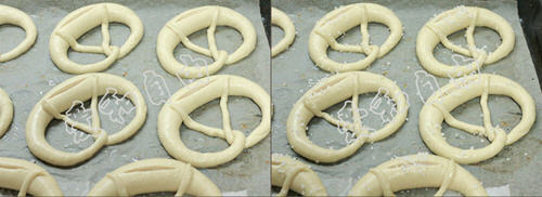 6、将面团绕圈,两头交叉(图6),扭转(图7)后翻上去,使两端搭在中间较粗的面团上,并轻压(图8)。